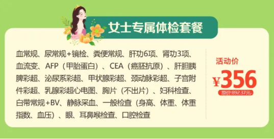 女性作为家庭与社会的重要角色,往往肩负多重责任,却容易忽略自身健康。本次推出的女士专属体检套餐,原价892.37元,活动期间仅需356元,涵盖20余项针对性检查项目,从基础健康监测到专科疾病筛查,全方位守护女性健康。
