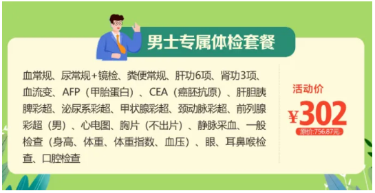 男性在社会与家庭中常扮演“顶梁柱”的角色,往往因工作繁忙忽视健康管理,不少疾病在初期难以察觉,等到发现时已错过最佳治疗时机。本次推出的男士专属体检套餐,原价756.87元,活动价仅302元,结合男性生理特点与常见健康风险,定制18项核心检查项目,为男性健康保驾护航。