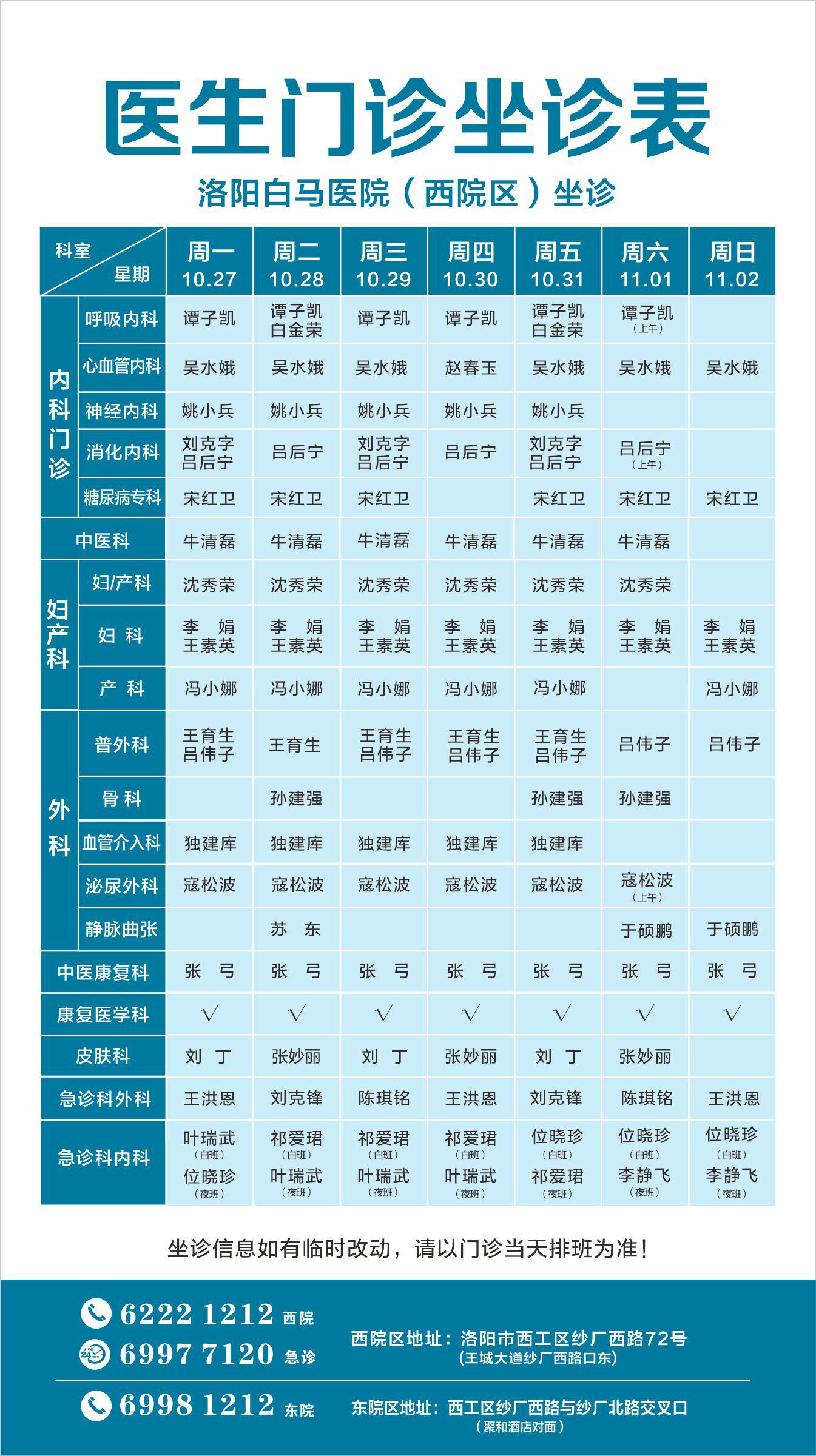 【10.27-11.02】洛阳白马医院医生门诊排班表