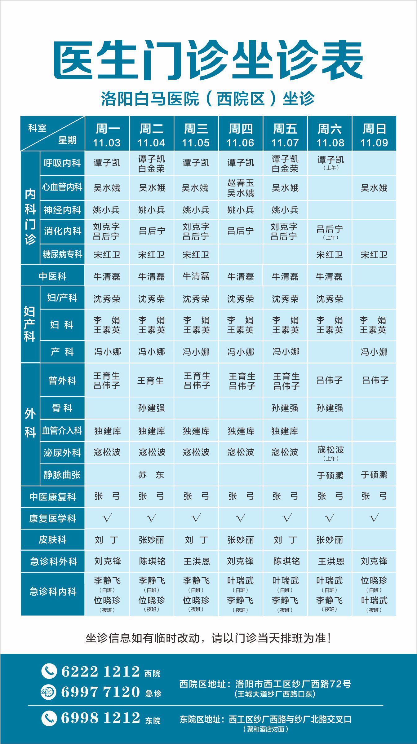 【11.03-11.09】洛阳白马医院医生门诊排班表