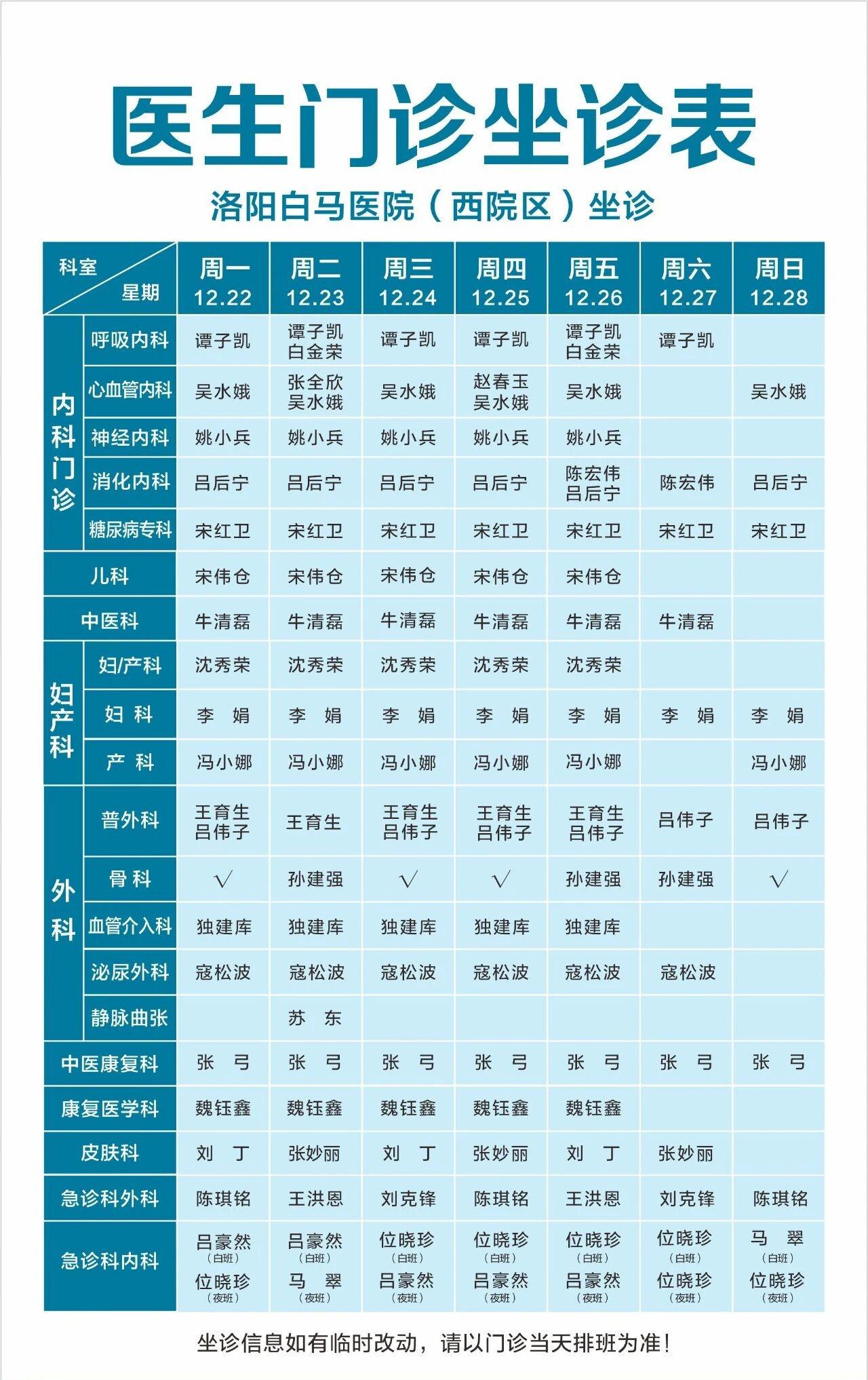 【12.22-12.28】洛阳白马医院医生门诊排班表