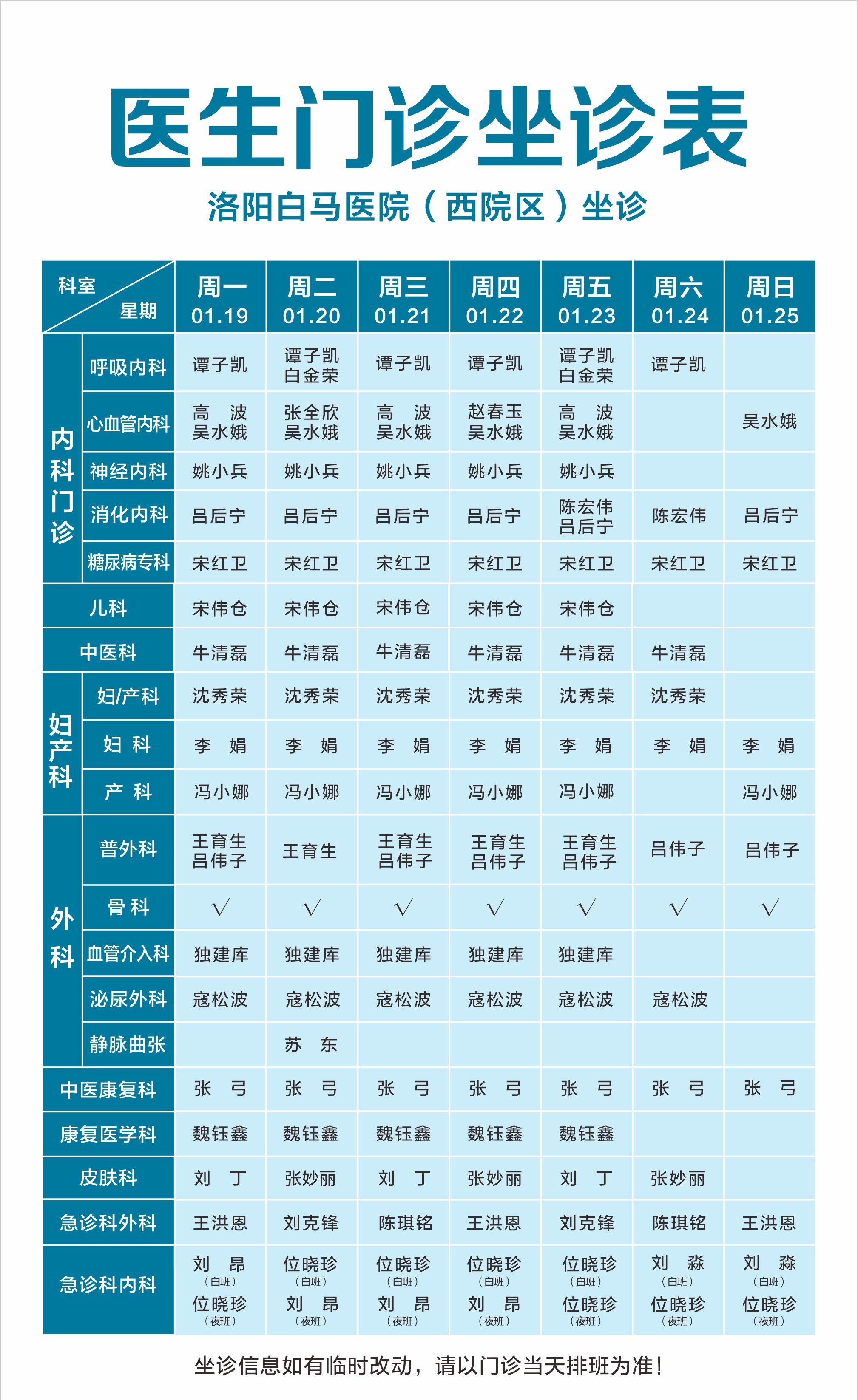 【1.19-1.25】洛阳白马医院医生门诊排班表