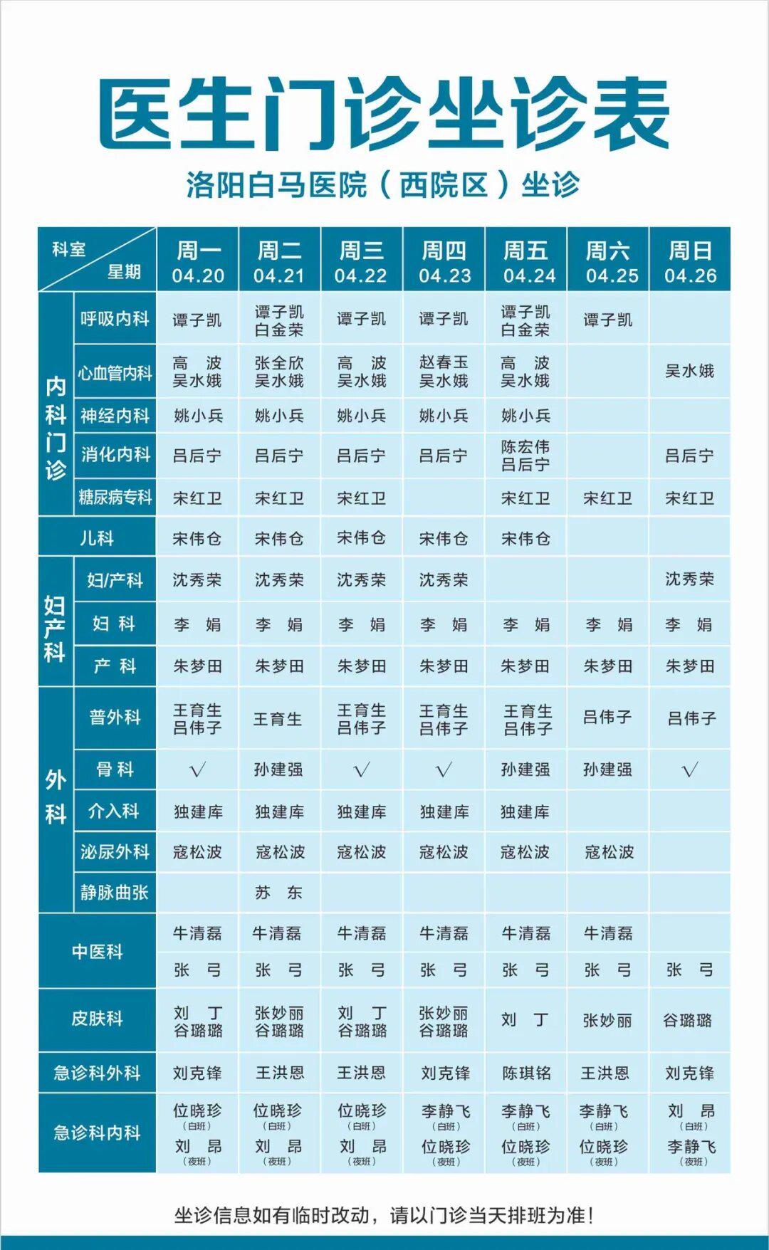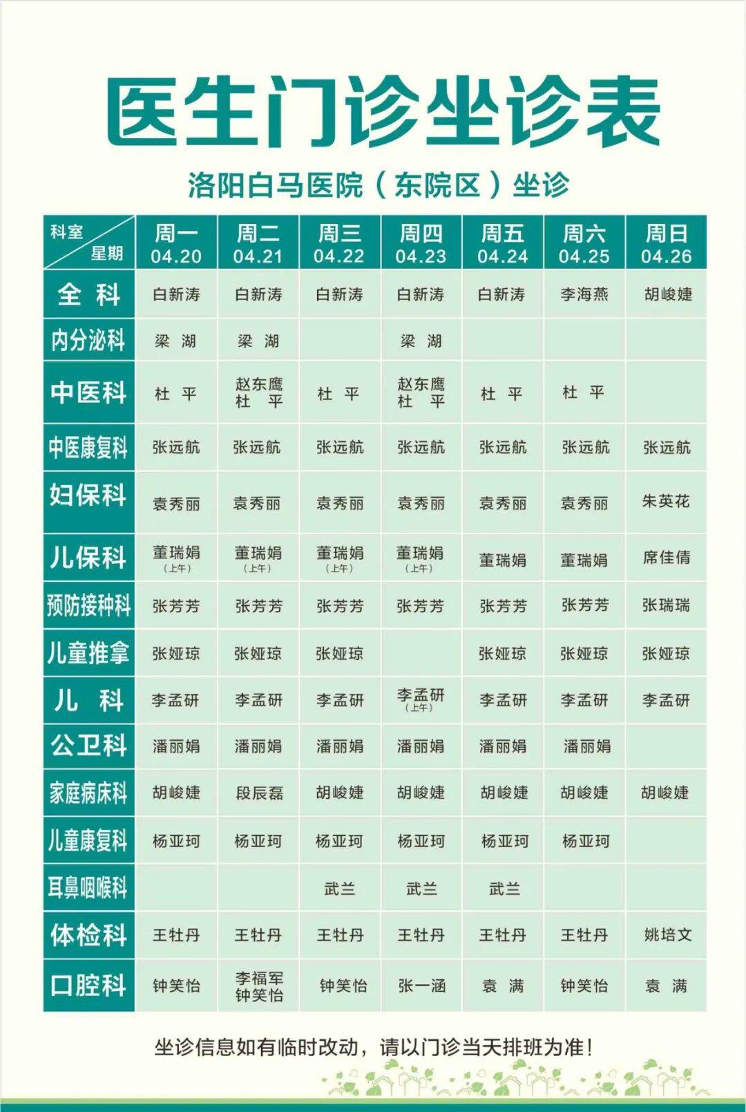【4.20-4.26】洛阳白马医院医生门诊排班表