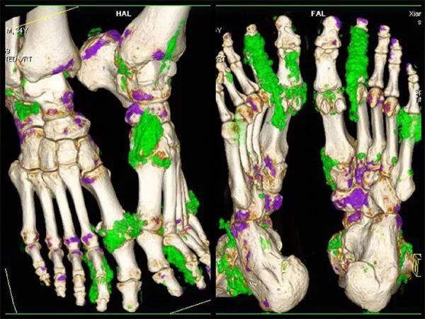 双源CT就是这个思路。它用高能量和低能量两种X光同时扫描关节。骨骼里的钙盐和尿酸盐结晶,对这两种X光的“反应”完全不同,就像有自己独特的“身份证”。