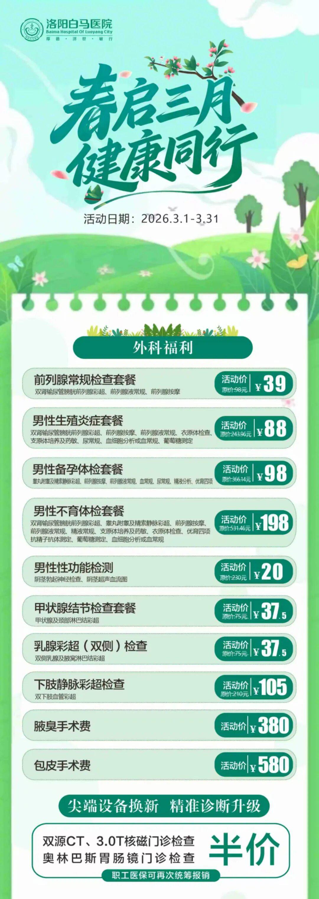 春启三月,万物复苏,正是关注健康、为身体做全面养护的好时节。洛阳白马医院特推出“春启三月,健康同行”健康守护活动,覆盖妇科、外科、消化内科、体检科等多科室,以专业的医疗服务和实在的优惠力度,为您的健康保驾护航。